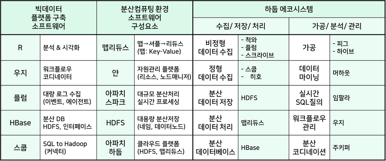 - 임팔라 (Impala): 하둡 기반 실시간 SQL 질의 시스템/ 인터페이스로 HiveQL 사용/ 수초 내에 결과 확인 가능
