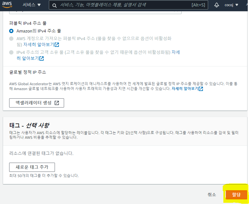- AWS EC2 는 다시 키거나 시간이지나면 IP가 바뀌므로 웹서비스를 고정으로 운영할수 없다. 따라서 고정 IP를 등록 하는것 . 프리피어에서는 1개의 고정 IP 를 무료로 등록 할수 있고 IP를 할당하고 인스턴스를 연동하지않으면 요금이 부과되므로 주의하자