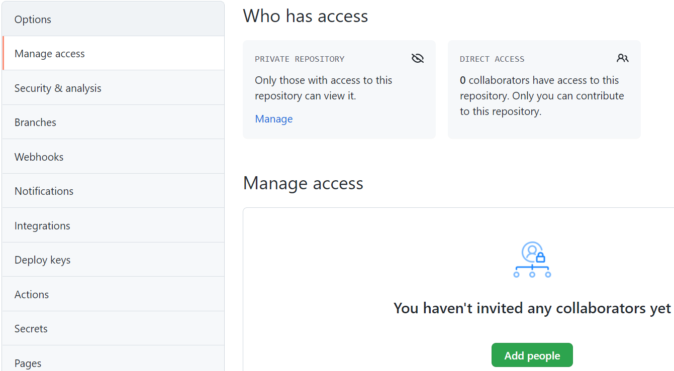 7. 저장소 생성 확인 후 settings -> Manage access -> Add People -> 팀원추가 !!