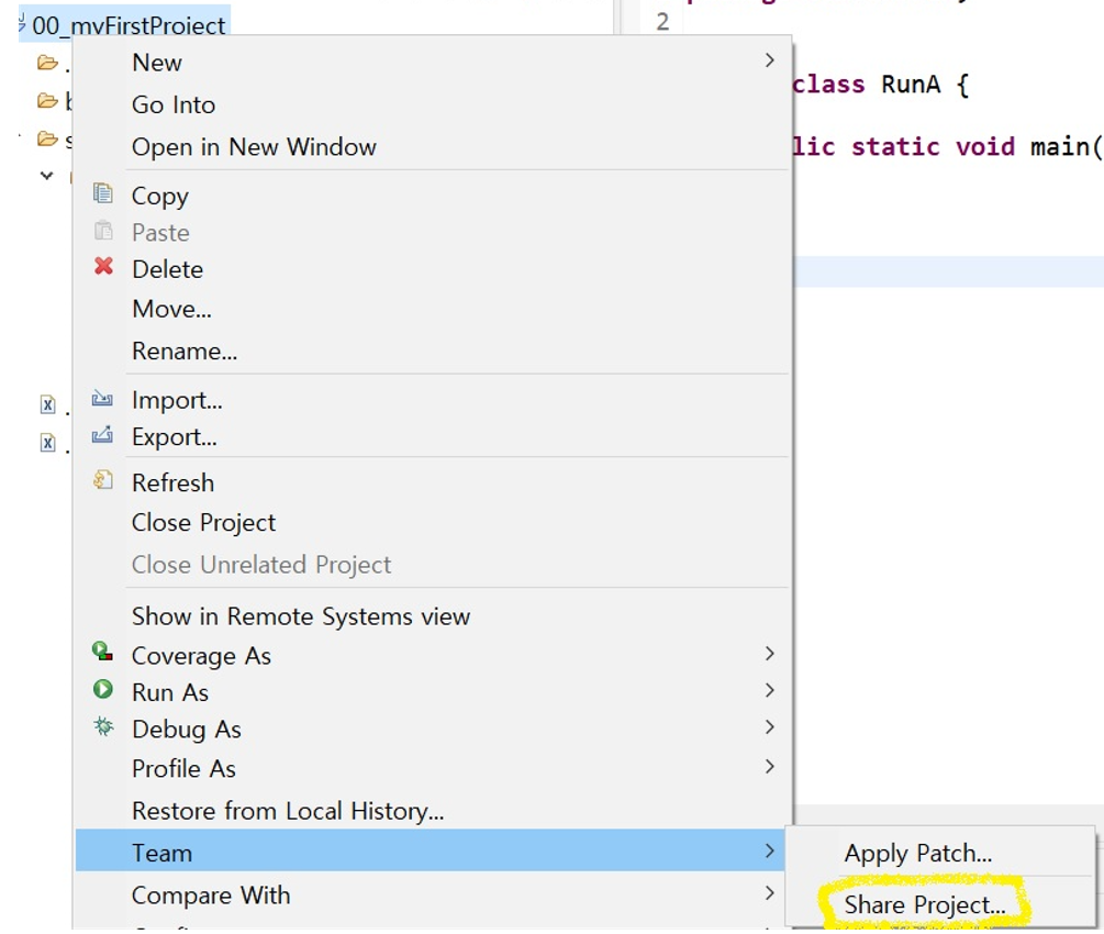 9. 프로젝트 추가하고 프로젝트 Team 우클릭 Share Project 클릭!!