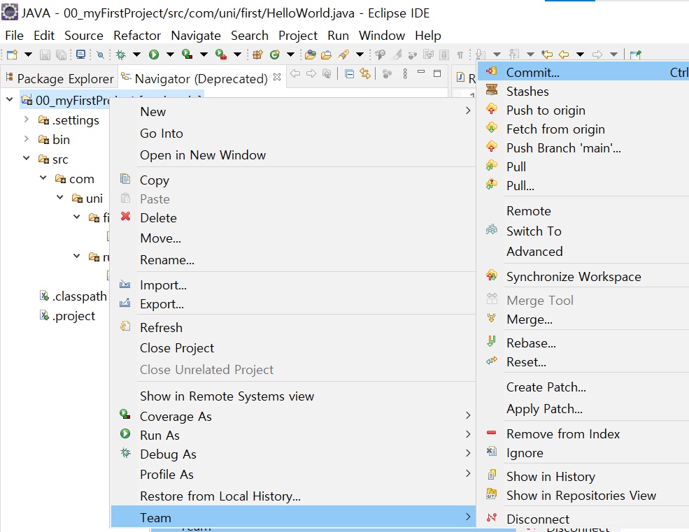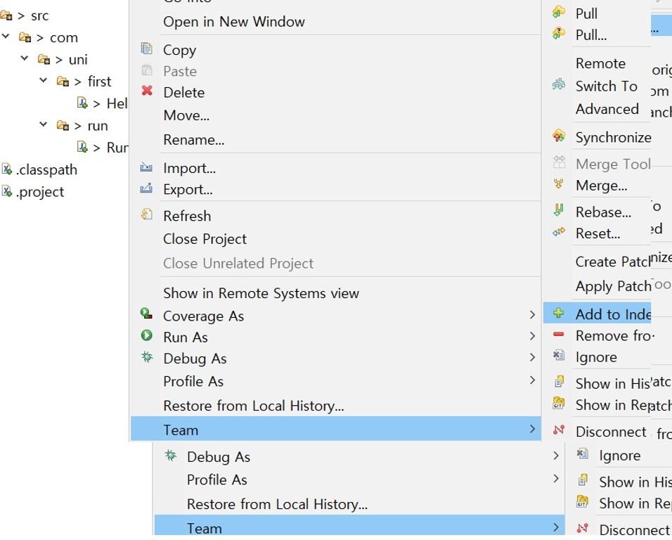 12. 프로젝트 우클릭 -> team -> add to index (staged 로 올라감 )