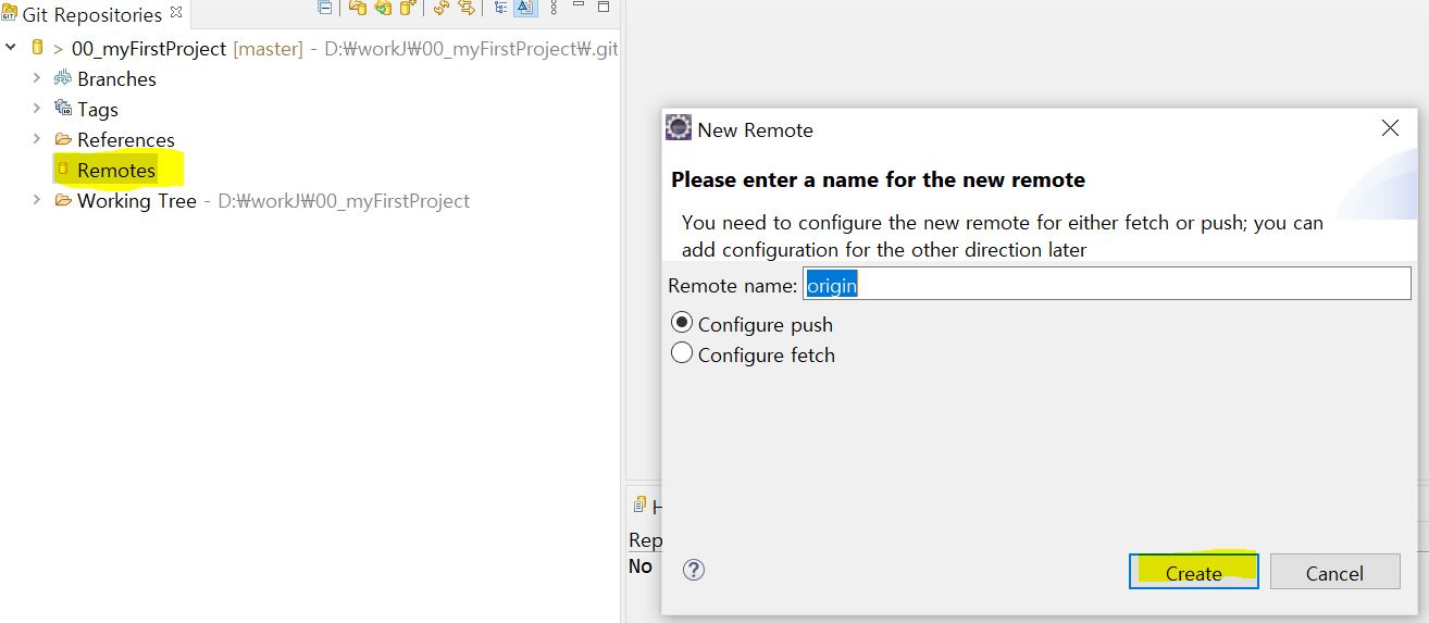 11. Git Repositories 에 Remotes 우클릭 create remotes 클릭 ! 후 아래와 같이 진행 ~!