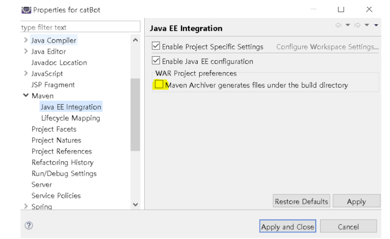 프로젝트의 Properties or 툴의 Preferences-> Maven -> java EE Integration
