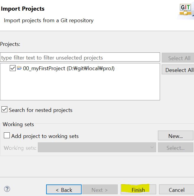 6. Browse 버튼 클릭후 D에 git 폴더 만들고 내에 clone 받을 폴더 추가 하여 선택 ~