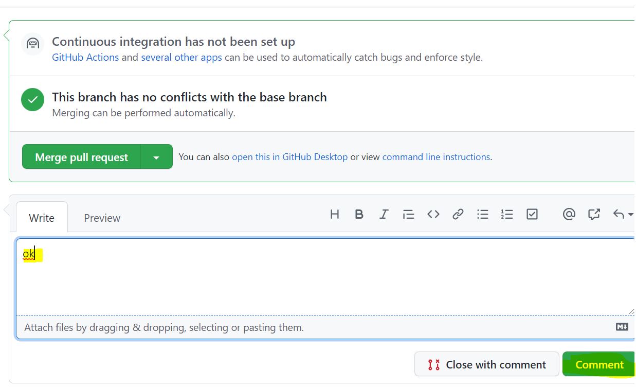 16. 협업을 위해 내용을 작성후 create pull request 버튼 클릭 !