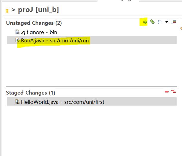 13. commit 진행 ! 수정한 내용 을 볼수있다. staged 에 변경사항을 추가하려면 + 부분으로 올리면됨.