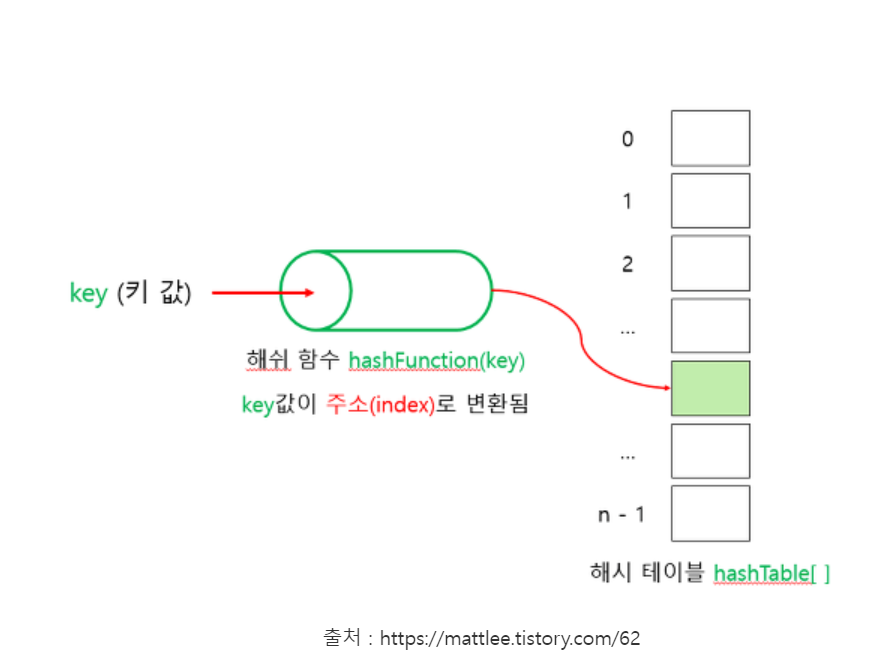 - 해시 함수 : 키를 입력으로 받아 해시 주소(hash address)를 생성하고 이 해시 주소를 해시 테이블(hash table)의 인덱스로 사용