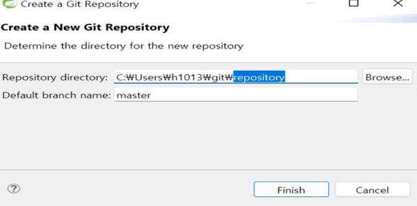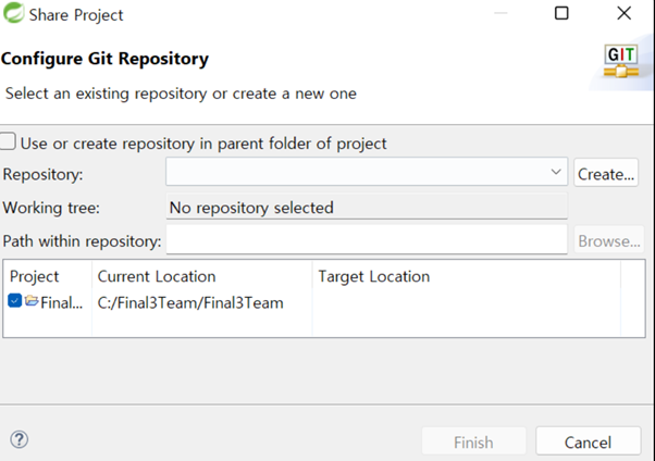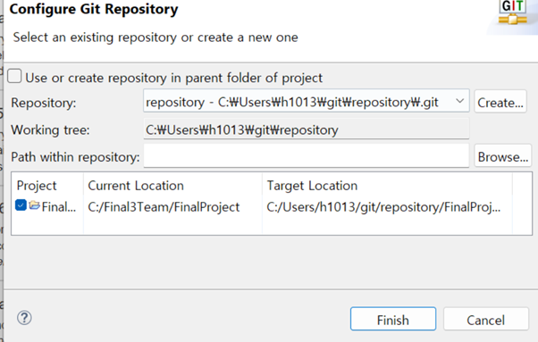 그러면 다시 창이 닫히고 이전 페이지가 보이는데 저장소 경로가 생긴것을 확인할 수 있다. 여기서 finish를 해주면 된다.