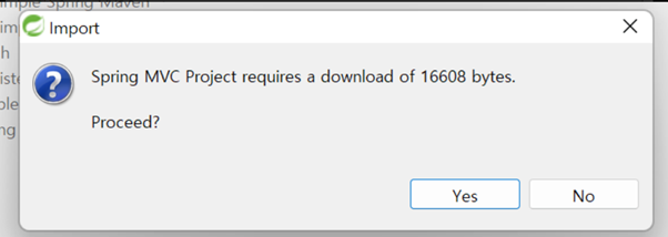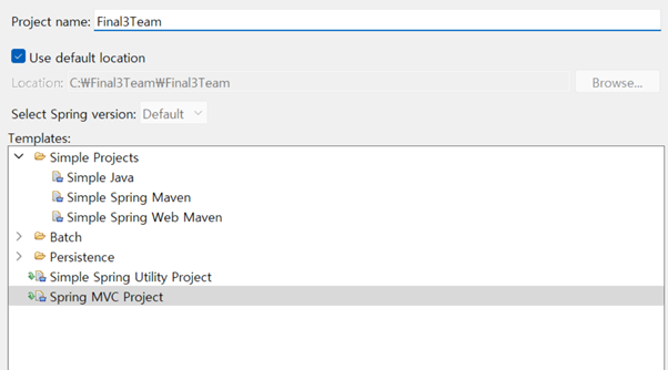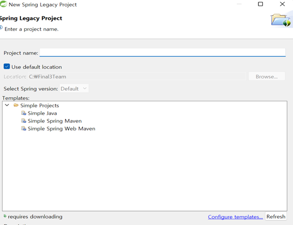 다시 spring을 재부팅 해서 legacy프로젝트 생성을 다시 클릭해보면 mvc 프로젝트가 생성이 된 것을 확인할 수 있다. mvc프로젝트를 클릭하고 프로젝트 명을 기입한 후에 next를 눌러준다.