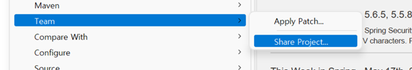 git과 연결하기 위해서 설정을 해줘야 하는데 프로젝트를 우클릭을 하고 Team → Share Project..를 한다.