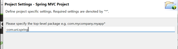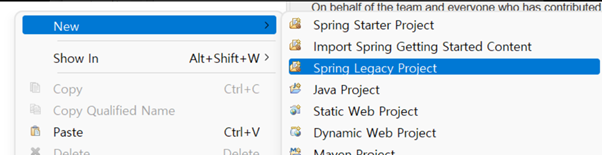 다시 spring을 재부팅 해서 legacy프로젝트 생성을 다시 클릭해보면 mvc 프로젝트가 생성이 된 것을 확인할 수 있다. mvc프로젝트를 클릭하고 프로젝트 명을 기입한 후에 next를 눌러준다.