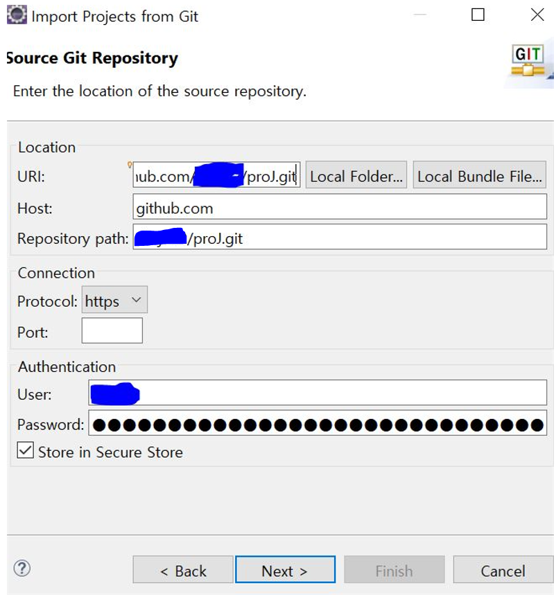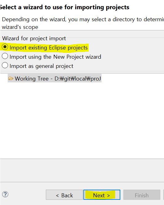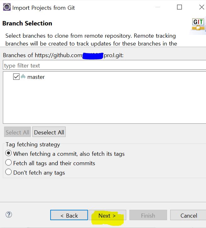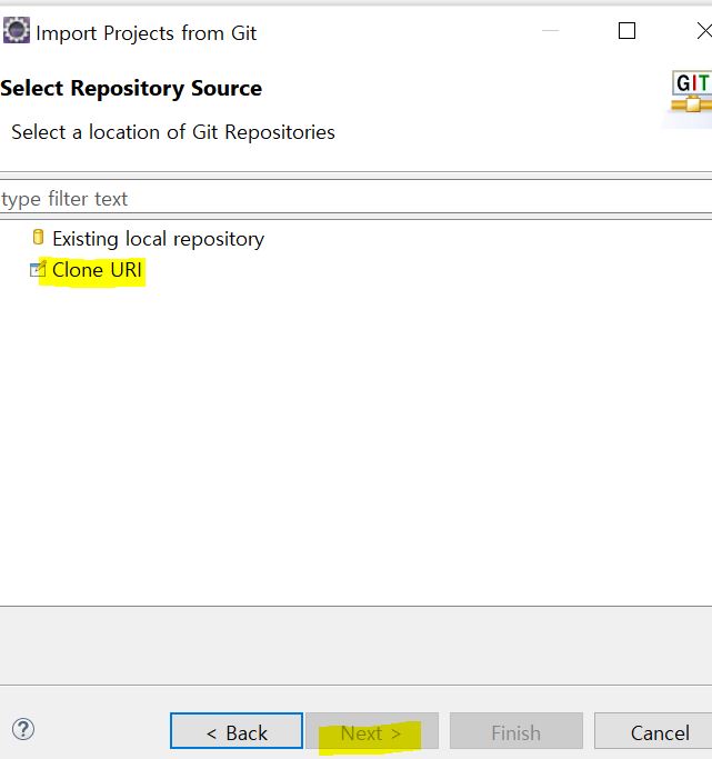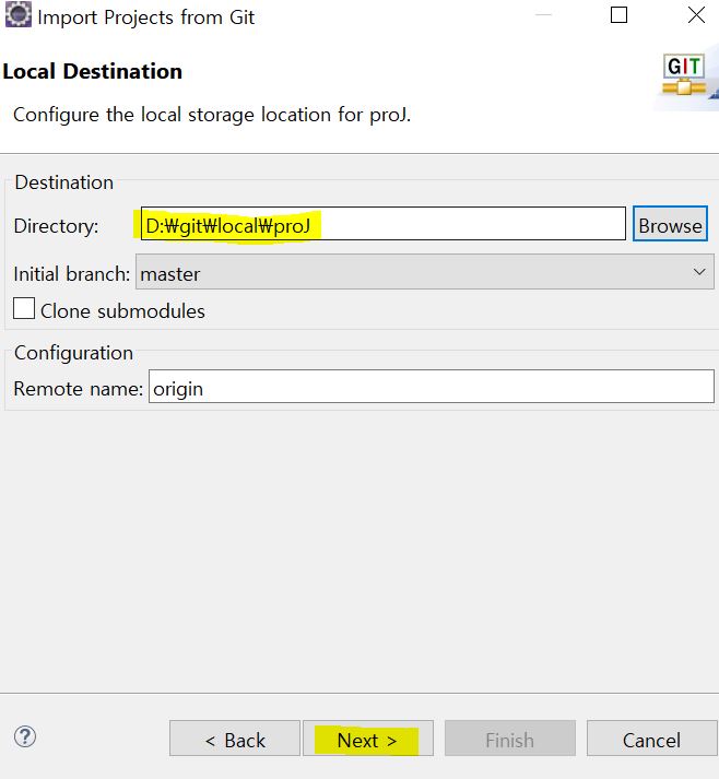 6. Browse 버튼 클릭후 D에 git 폴더 만들고 내에 clone 받을 폴더 추가 하여 선택 ~