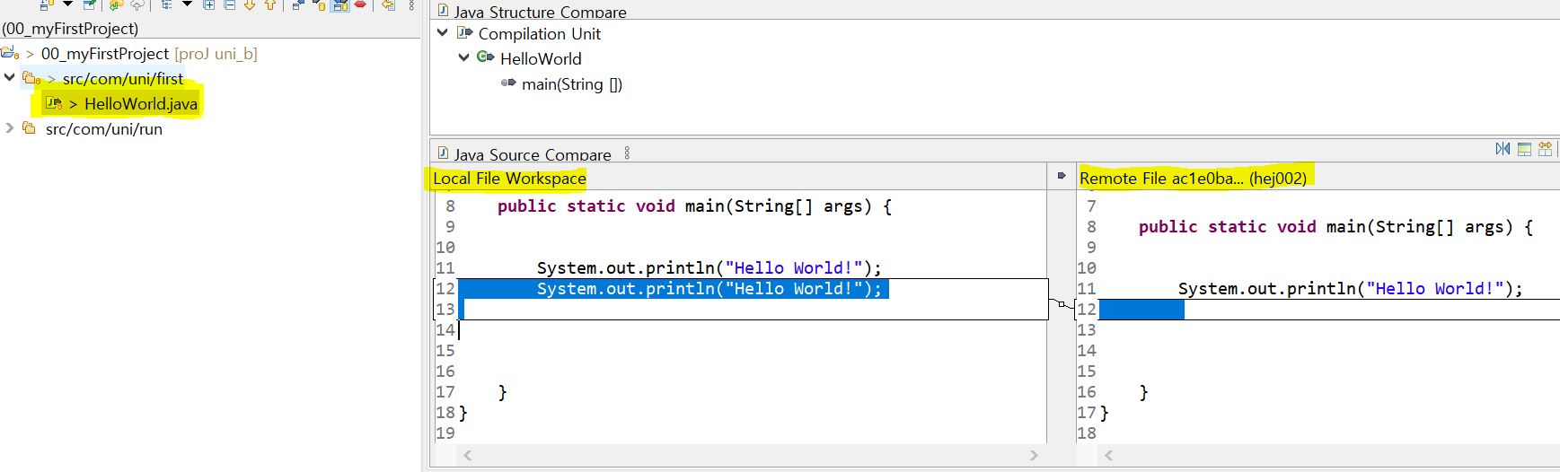 11. synchronize workspace 로 들어가서 확인하면 내 local에서 변경 한부분이 확인가능하다.
