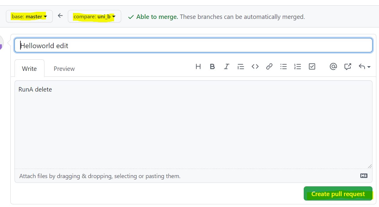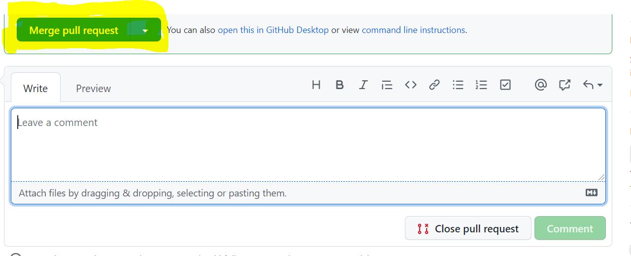 16. 협업을 위해 내용을 작성후 create pull request 버튼 클릭 !