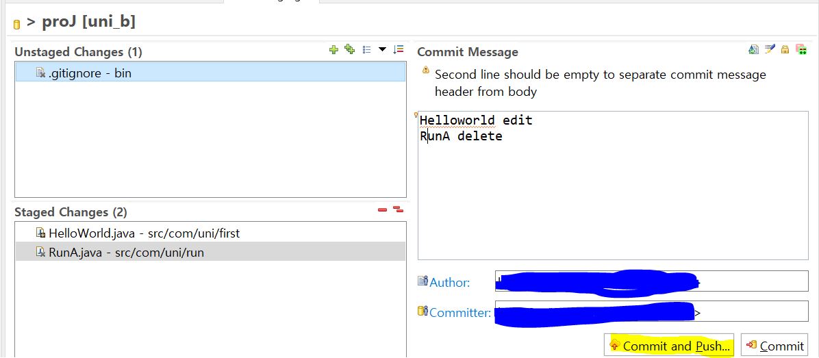 13. commit 진행 ! 수정한 내용 을 볼수있다. staged 에 변경사항을 추가하려면 + 부분으로 올리면됨.