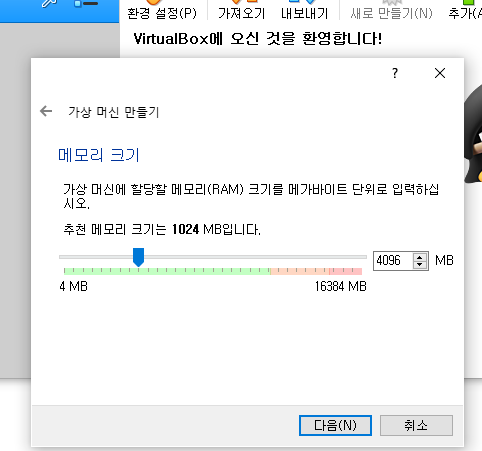 3. 가상머신메모리할당- 본인컴퓨터환경에 맞게 할당, 보통 4GB
