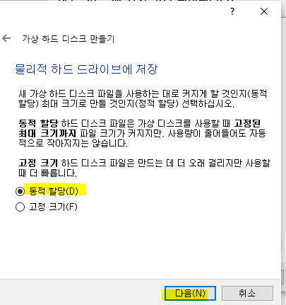 디스크용량을 동적으로 할지 고정으로 할당할지 결정. 동적으로 하는것이 고정으로 지정한 크기 만큼